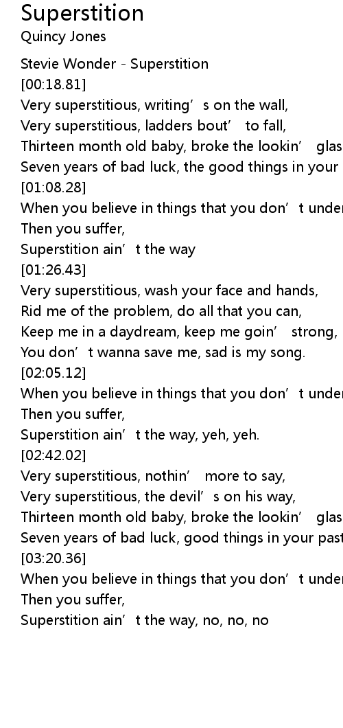 "Stevie Wonder - Superstition (lyrics)", Stevie Wonder Superstition lyrics Very superstitious, Writing's on the wall, Very superstitious, Ladders bout' to fall, Thirteen month . This site is an open community for users to share their favorite pics on the internet, all images or pictures in this site are for personal pix use only, it is stricly prohibited to use this pics for commercial purposes, if you are the creator and find this images is shared without your permission, please kindly raise a DMCA report to Us.